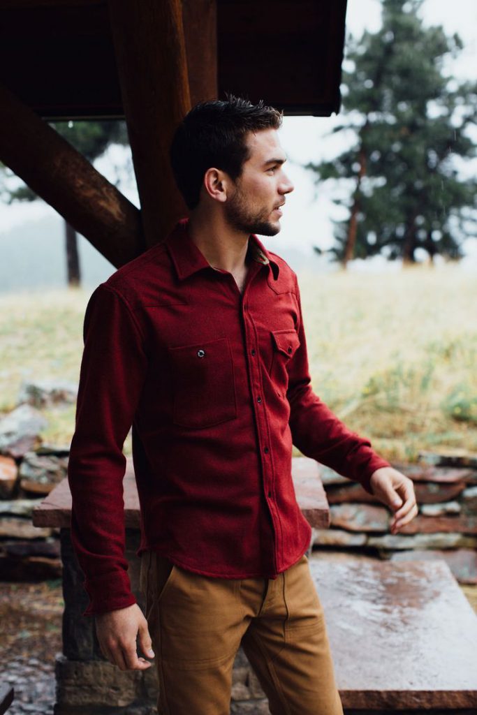 Для чоловічої аудиторії стилісти рекомендують носити червоні тони приглушені в якості центрального аксесуара в ансамблі. Наприклад, темно-червоний джемпер чудово поєднується з чорними джинсами і простий шкіряною курткою коричневого кольору. Червону сорочку краще доповнити діловим костюмом (сірий, чорний, оливковий колір). Взуття має відповідати тону верхнього одягу.