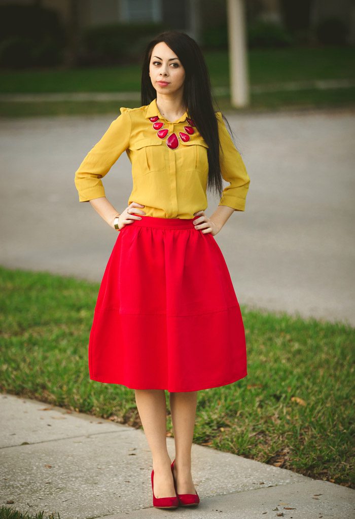 Поєднувати червоний і жовтий колір в одязі допустимо в літніх ансамблях і іноді в осінніх образах. Такий колористичний експеримент підходить молодим і енергійним дівчатам. Сонячні композиції підійдуть для екстраординарної творчої жінки. Епатажні чоловіки теж не цураються подібних рішень.