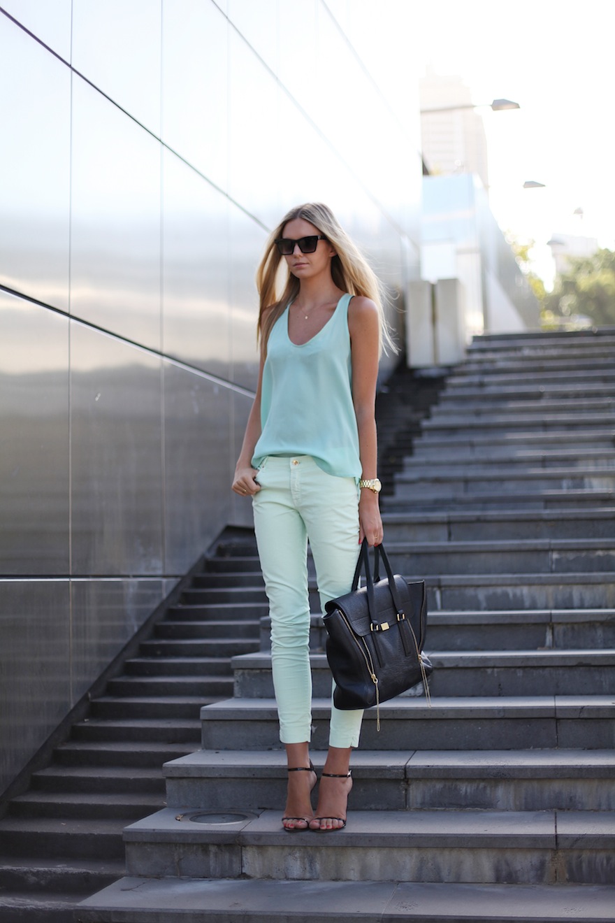 Чорні босоніжки на шпильці з м’ятними брюками і блузкою
