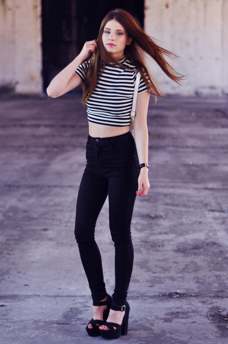 Чорні замшеві босоніжки з чорними брюками і топом в смужку