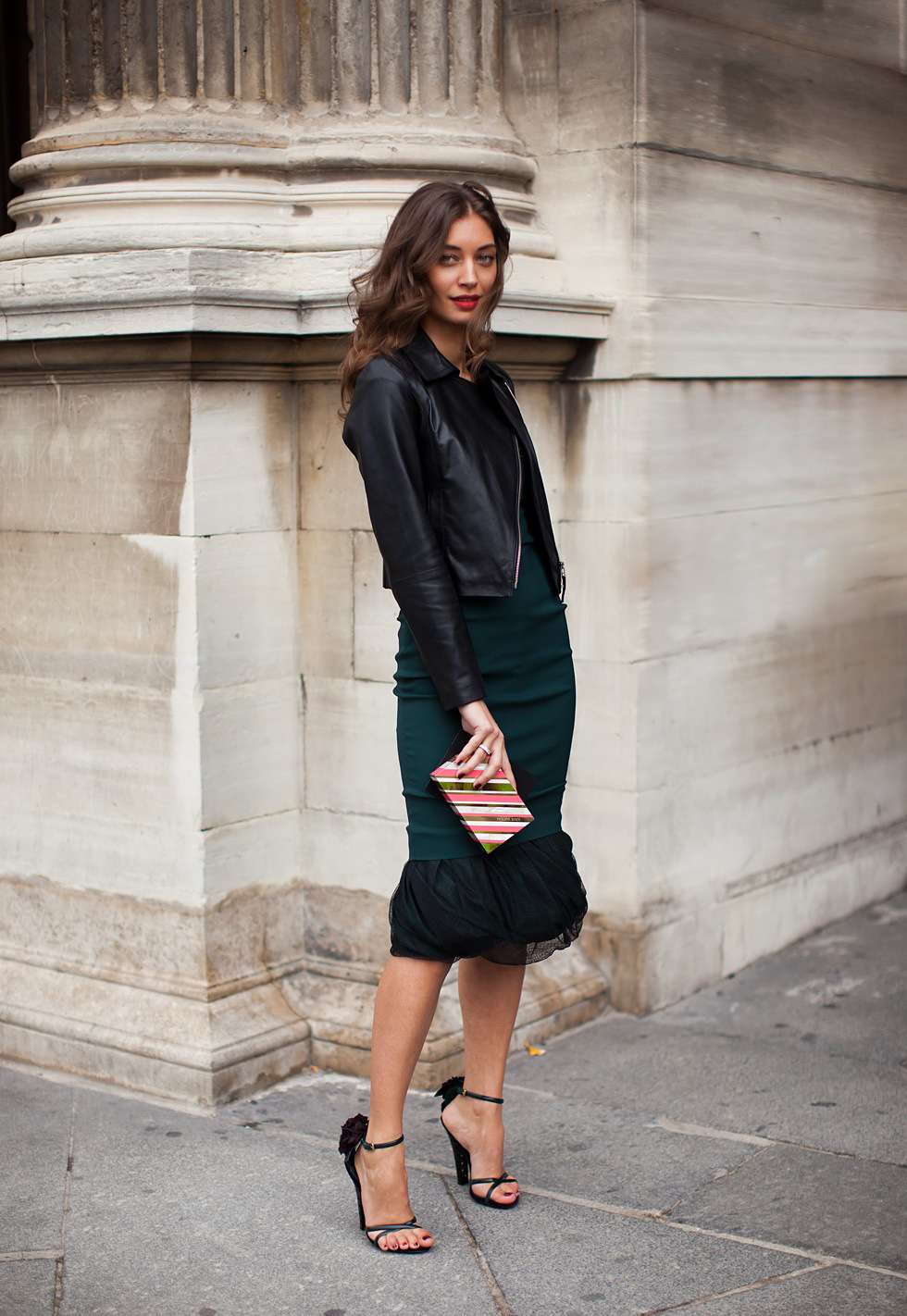 Чорні босоніжки з зеленим сукнею і чорною курткою
