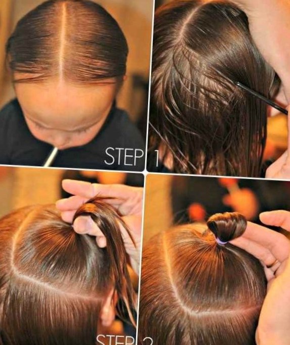 Верхня частина волосся збирається в хвостик і закріплюється яскравою шпилькою. Нижня частина волосся додається до верхньої і закріплюється також шпилькою.