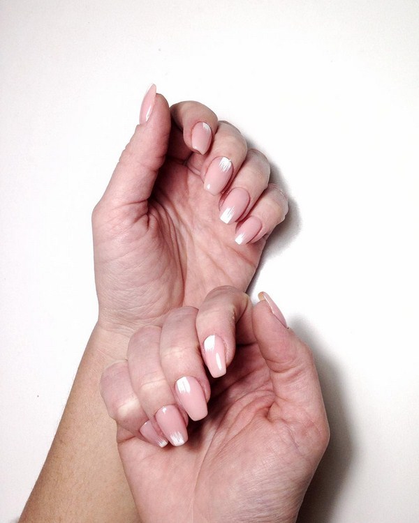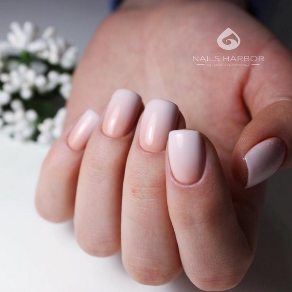 Повноцінно розкрити всю красу і ніжність відтінків в стилі нюд на нігтях дозволяє градієнтний колірний перехід. Створіть розтяжку кольору на нігтях з нюдовым лаком в тандемі з білим тоном. Модне нюдовое омбре на нігтях прекрасно і в горизонтальному рішенні, від пальчика до пальчику з іншим кольором покриття, нюдовый лінійний манікюр омбре також чудовий.
