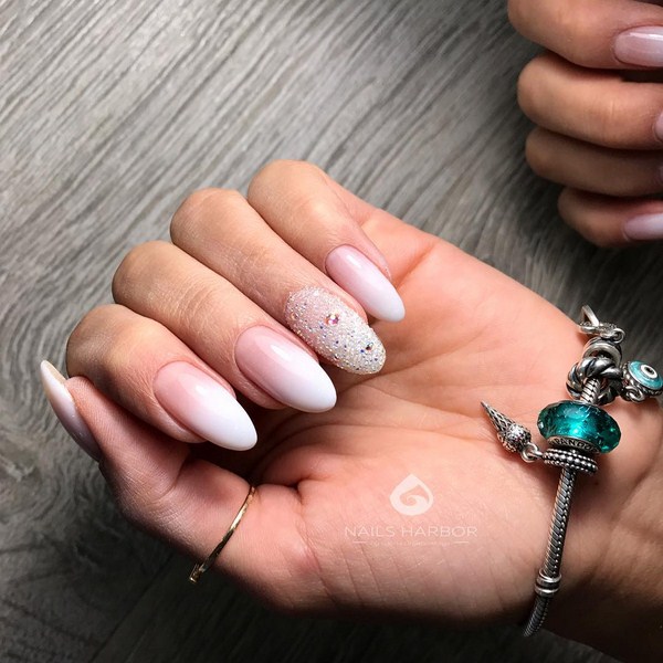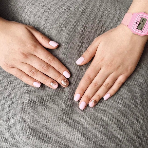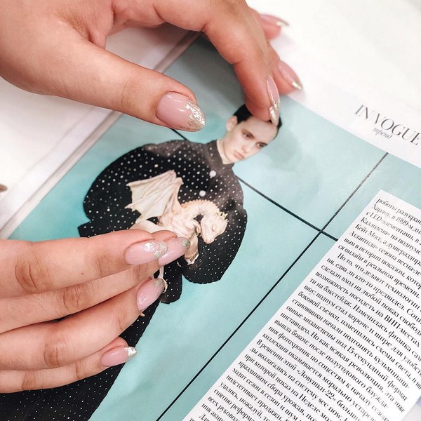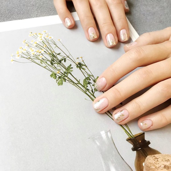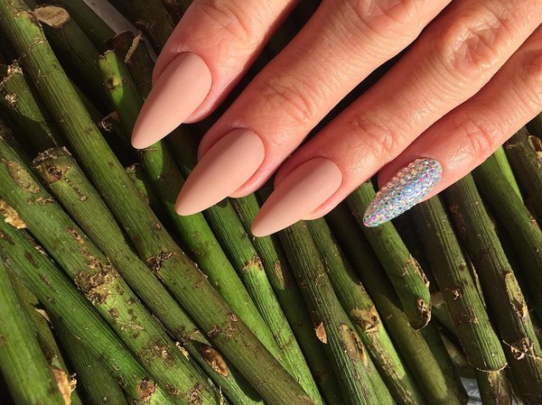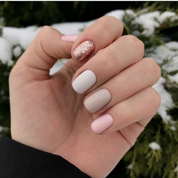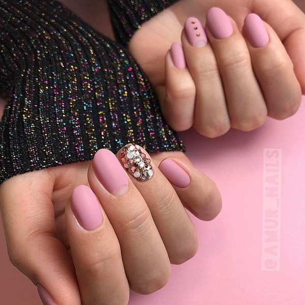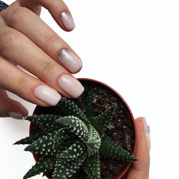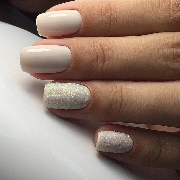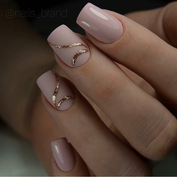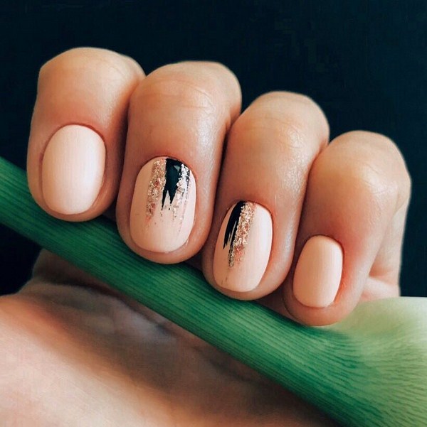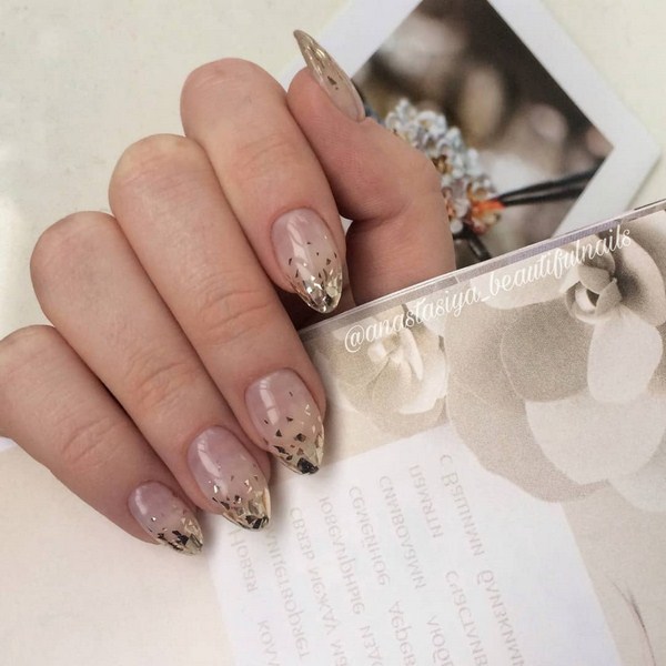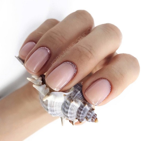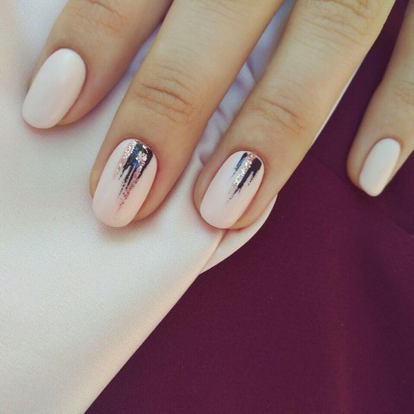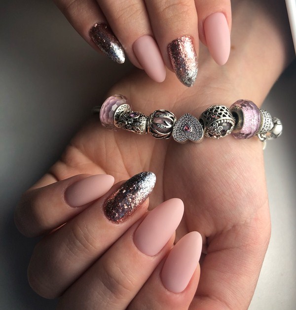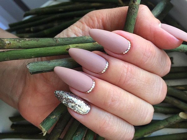 Граничну ніжність нюдового нейл-арту можна розбавити блискітками, використовуючи гліттер, слюду, фольгу. Нюдовые нігті з блискітками прекрасні на будь-якій формі пластини і довжині, дозволяючи створювати шикарні нюдовые нейл-дизайни для урочистостей і також дивовижний нюдовый манікюр для повсякденних луків. Рекомендуємо вам виділити парочку пальчиків з блискітками нюдовым лаком у матовому виконанні.