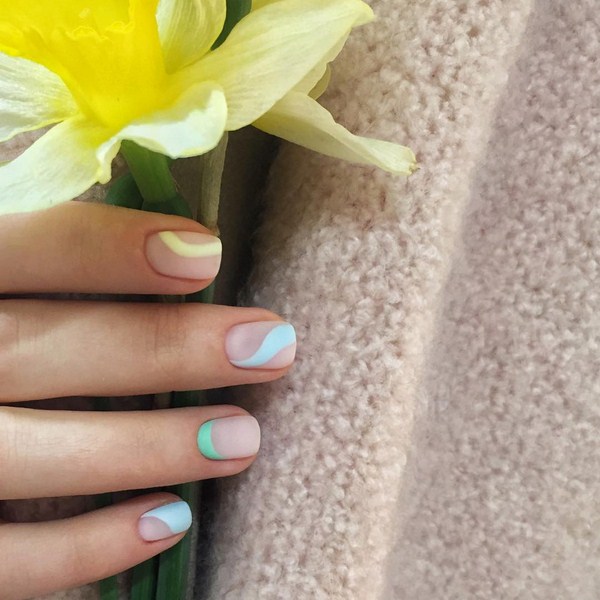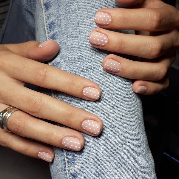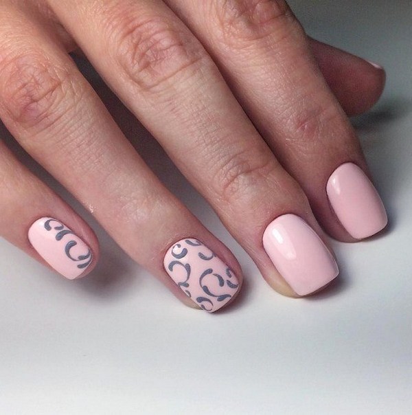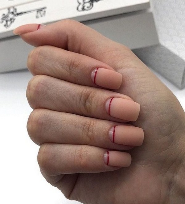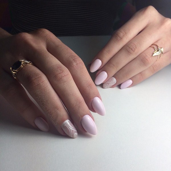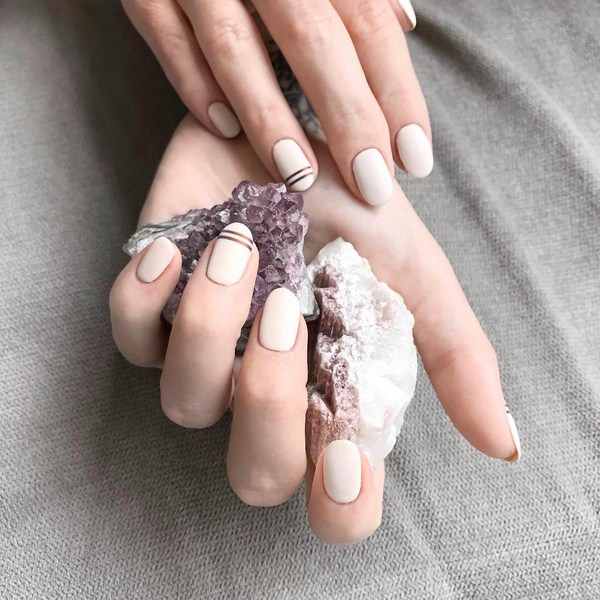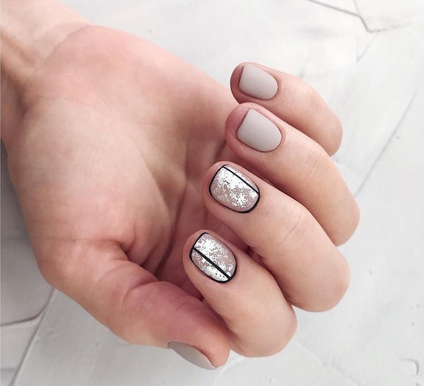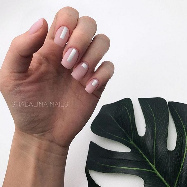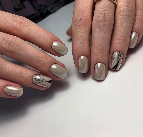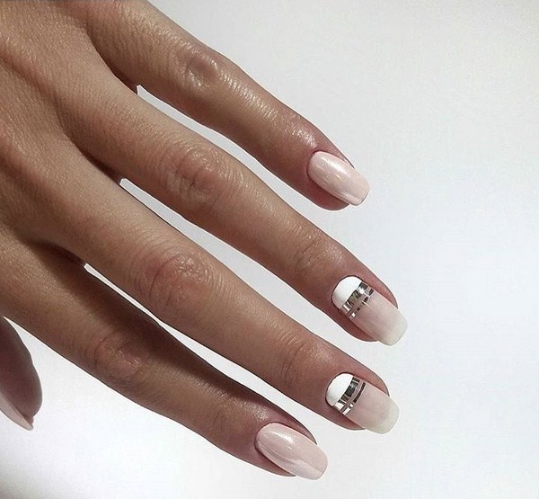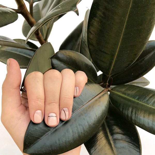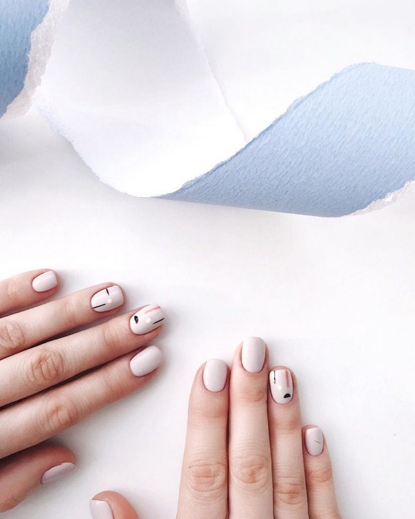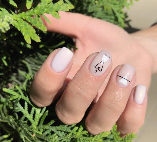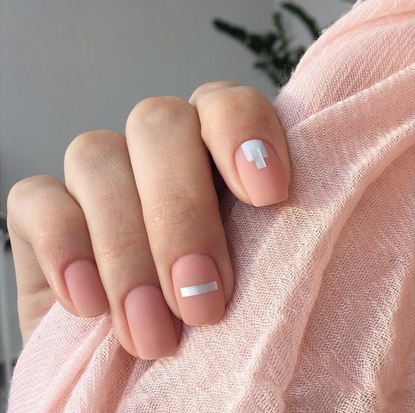 Відмінно виглядає ніжний nude в тандемі з геометрією і різного роду графічними елементами, що грають на контрасті, надаючи родзинку будь-якого модного манікюру в нюдовом стилі. Створіть стильні замальовки з трикутниками, лініями і точками на одному або двох пальчиках, дотримуючись мінімалістичного напрямки, що так актуально на сьогодні. При бажанні можна зробити різні геометричні малюнки і використати блискітки і втирку для ефектності модного нюдового дизайну 2019-2020.