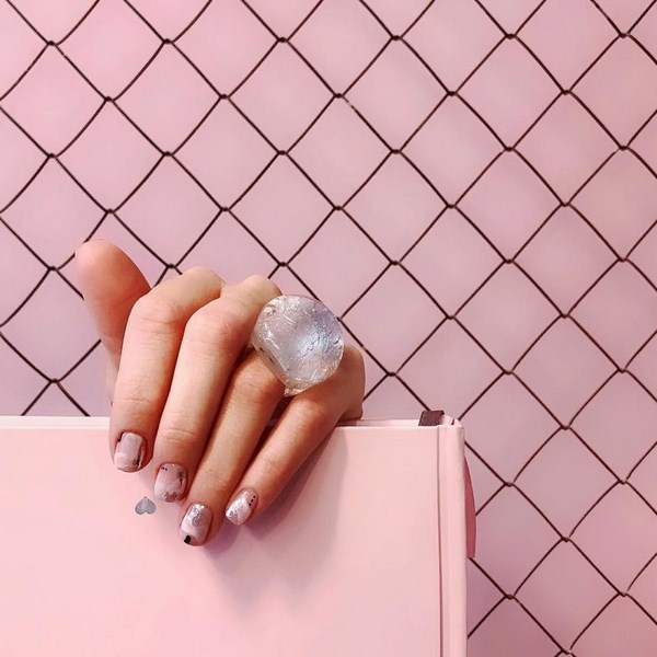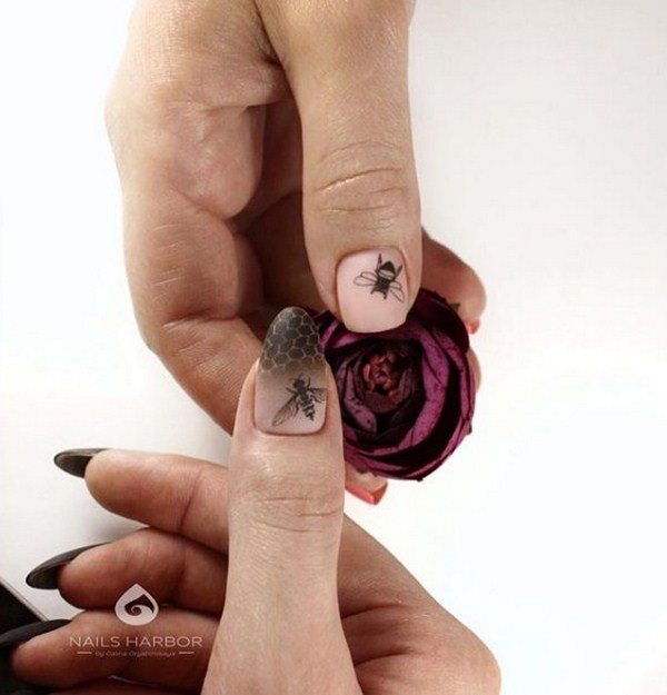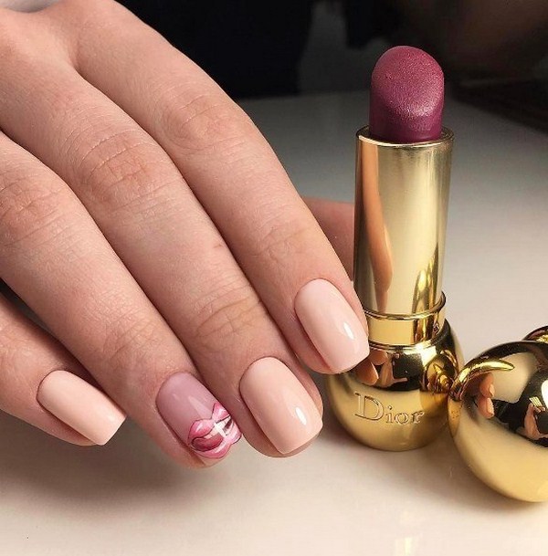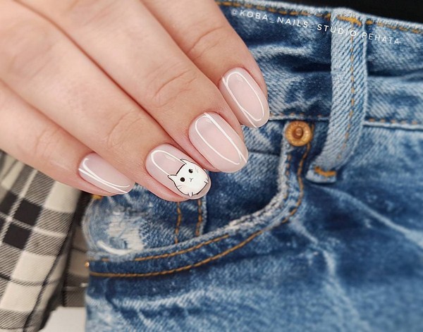 Мегастильный і самодостатній нюдовый манікюр 2019-2020 роки може бути і веселим, грайливим, романтичним або ж лаконічним. Додати різноманітність нюдовым покриттям і модного манікюру nude покликані принти і малюнки – прості і нехитрі, як наприклад, кішечки, дельфін, або ж стильні графічні малюнки, а також романтичні квіти та гілочки.