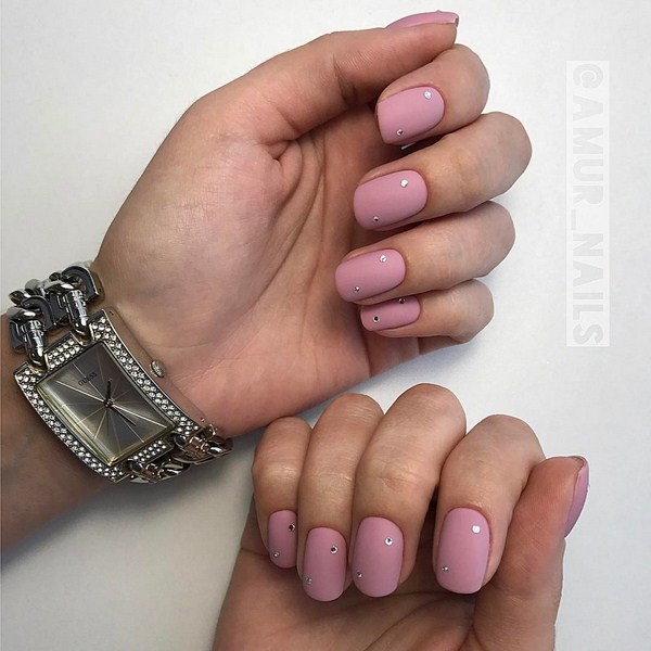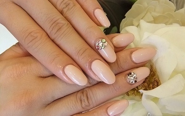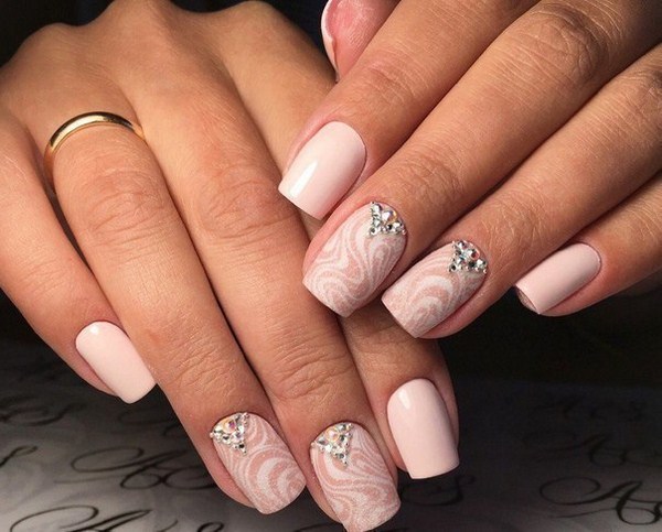 Нюдовые ноготочки у своїй чарівною витонченості і витонченості чудові поєднуються з блиском стразів і кристалів. Блискуча ніжність на нігтях з нюдовым покриттям і стразами виглядає одночасно помпезно і чарівно, витончено і шикарно. Камінчики, кристали, бульонки у вигляді композицій, фігур, покриваючи весь пальчик цілком або частково – виглядає в нюдовом дизайні ідеально. Це можуть і модні нюдовые нігті для весільного сету, вечірки, корпоративи та іншого урочистого заходу.