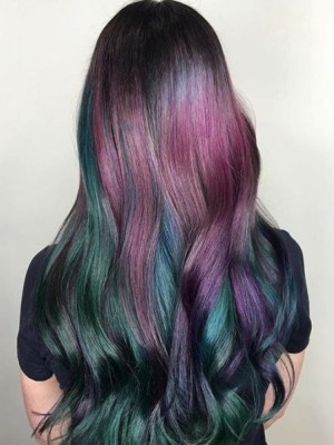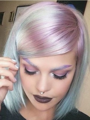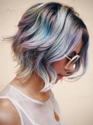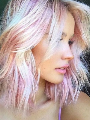 На базі блонда hair-стилісти тоненькі пасма фарбують в пастельний рожевий, фіолетовий, блакитний, ніжно-зелений. Вони черпають натхнення, дивлячись на прекрасні опали. Така фарбування середніх волосся буде під силу тільки досвідченому і сміливої професіоналу, самостійно повторити найніжніші відтінки точно не вийде.