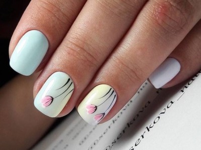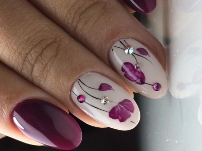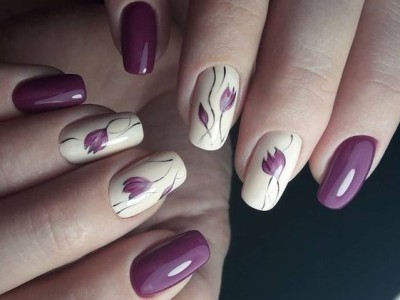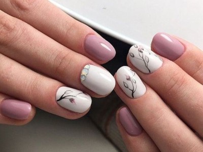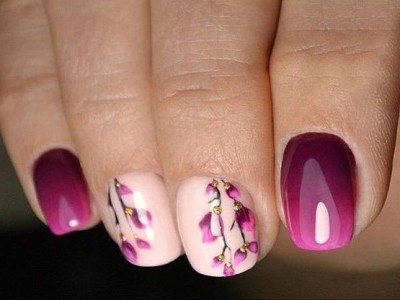 Це найпоширеніший нейл-арт. Гілочки виводите на пастельній базі, а ноготочки поруч покриваєте-яким кольором. Відмінне рішення – продублювати тон в кольорі пелюсток.