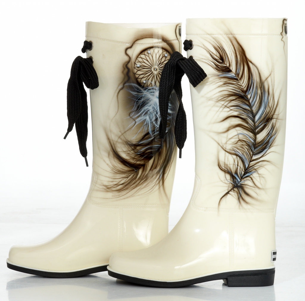 Перед нанесенням фарби гумові чоботи необхідно злегка потерти наждачним папером і знежирити поверхню. Потім нанести контур малюнка і розфарбувати малюнок акриловими фарбами. Дати фарбам висохнути і закріпити зверху безбарвним автомобільним лаком. В якості орнаменту можна вибрати строгі геометричні фігури, яскраві квіти, метелики, сніжинки та інше, а також будь-фантазійний малюнок, відповідний до вашого повсякденного одягу й аксесуарам.