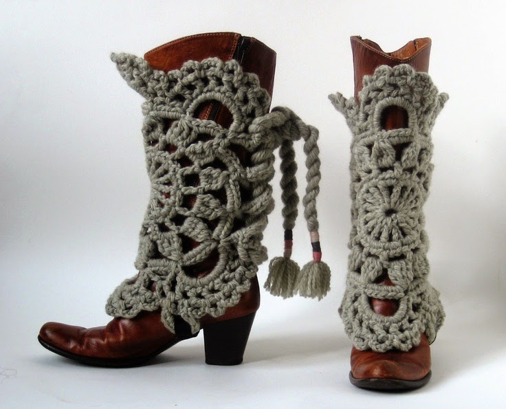 На замшевих чоботах в якості оригінального прикраси краще всього використовувати в’язане халяву. Халява для замшевих чобіт в’яжеться окремо. В’язку можна вибрати будь — рельєфну або просту, з великим або дрібним орнаментом, з рослинним або геометричним візерунком, використовуючи однотонну, в колір взуття, або різнобарвну пряжу. Полотно за бажанням можна прикрасити намистинами, тасьмою, гудзиками або стразами. Довжина в’язаного халяви повинна трохи прикривати підстава каблука. Потім готовий декор просто пришивається по верхній окантовці чобіт і опускається по всій довжині халяви до каблука. Це дуже вдалий варіант прикраси, так що при необхідності його легко замінити на новий.