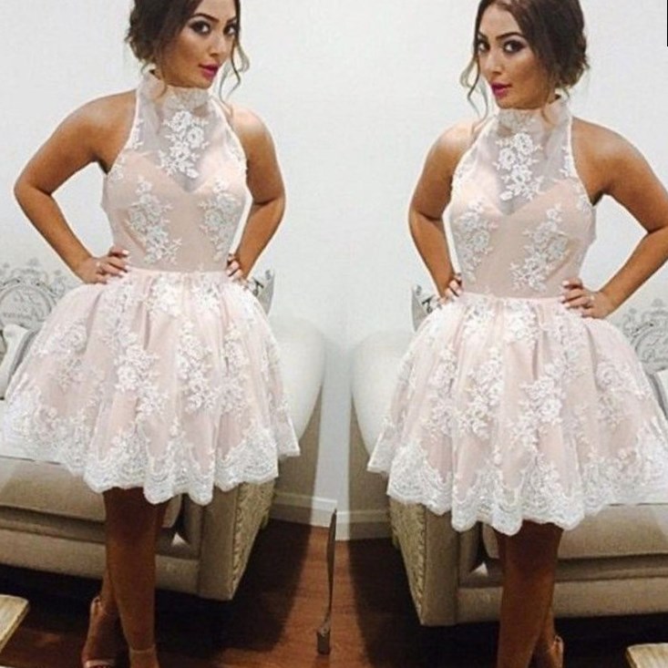 Vestidos Graduacion високої шиї мережива плаття випускного вечора 2017 off-плечі аплікація з органзи короткі