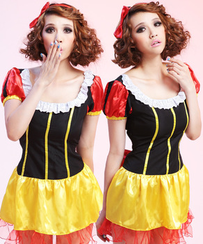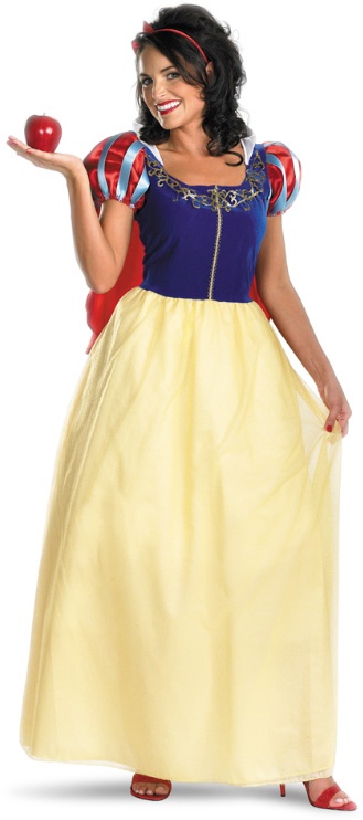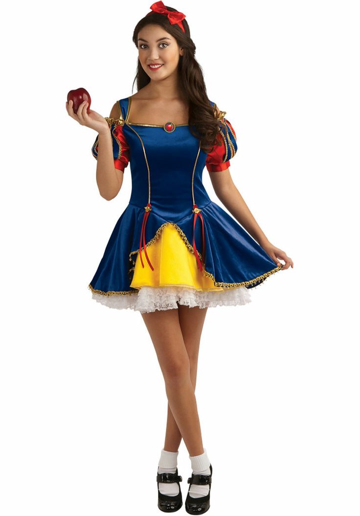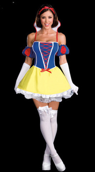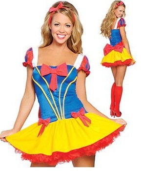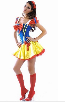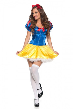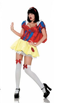 Вони будуть відрізнятися ступенем відвертості. Дівчата можуть вибрати відкритий костюмчик Білосніжки, який складається з короткої спідниці з нижніх спідниць і з короткої синьої кофтинки-болеро з короткими рукавами. Так само ви можете надіти корсет синього кольору з окремими рукавами-ліхтариками. Не забудьте про щільні панчохи білого кольору з підв’язками на червоних бантиках і про червоні лакові туфлі на витончених каблучках. За бажанням ви можете прикрасити свої волосся червоним обідком з бантиком. Цей образ буде доречний на будь-якій вечірці. Еротичний образ Білосніжки більш фривольний. Спідничка в ньому ледь прикриває сідниці, а під нею красуються тонкі червоні стрінги. Верх виконаний у вигляді ліфчика синього кольору, а на ногах красуються червоні панчохи у велику сіточку.