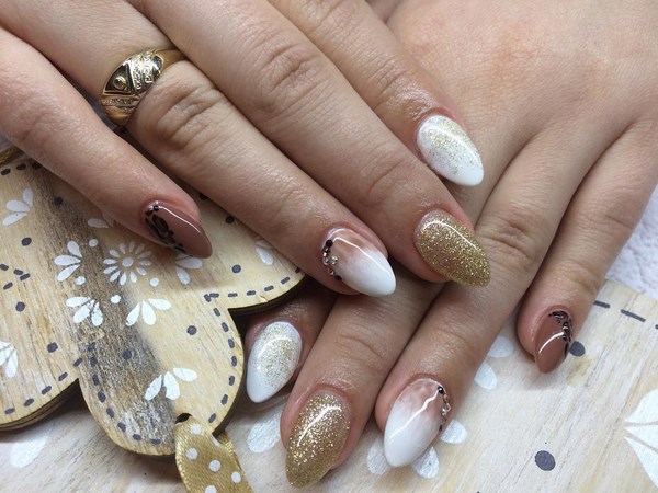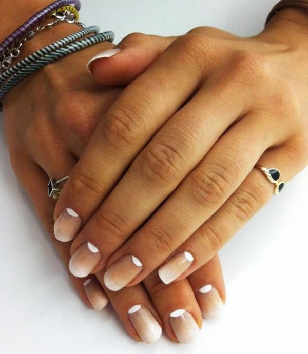 Чудово виглядає ніжний і модний манікюр омбре з використанням бежевого і білого, ніжно-блакитного і рожевого гель лаку. Також можна прикрасити нігтики різнокольоровими точками, наклейками, ажурними візерунками, стразами.