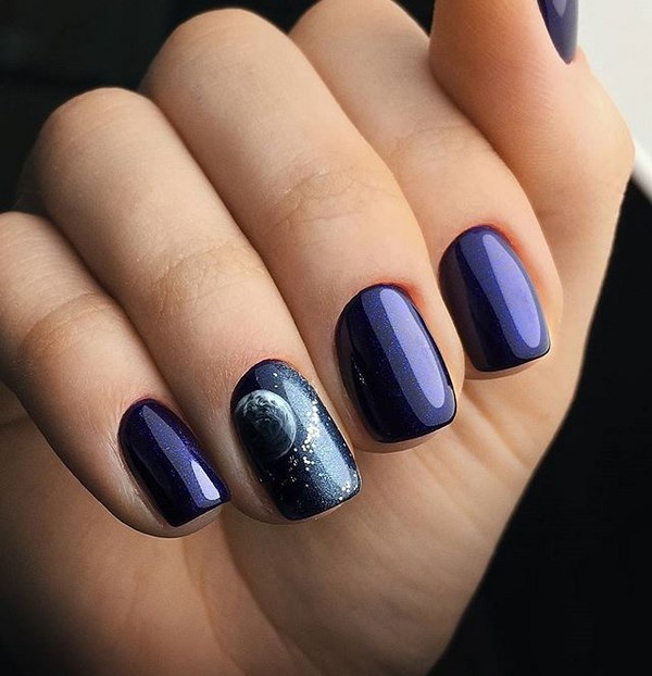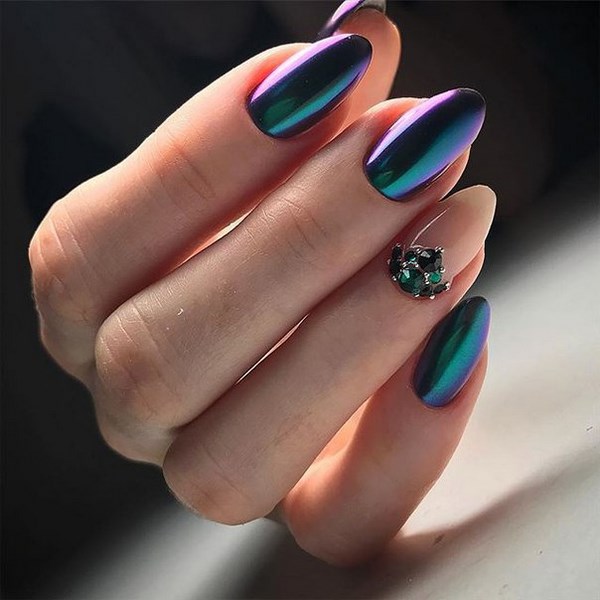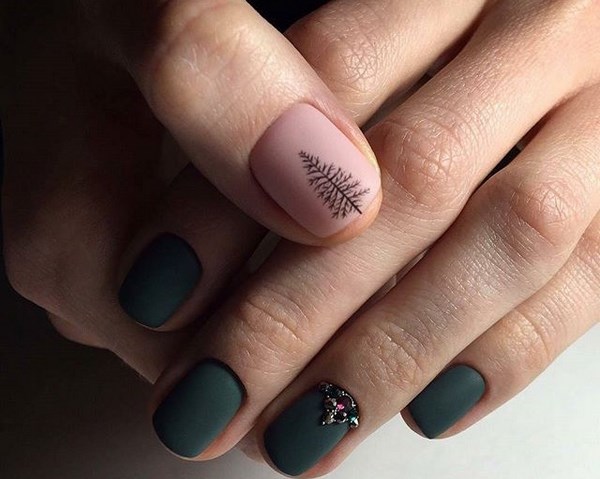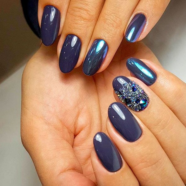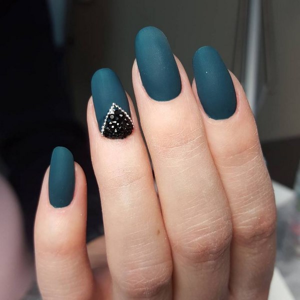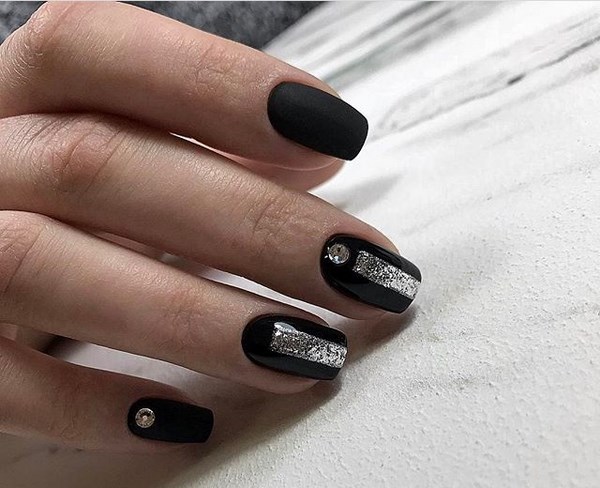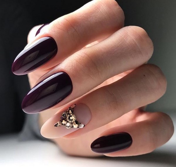 Звичайно ж, монохромний манікюр у темному кольорі виглядає досить просто і трохи нудно, тому варто доповнити його розписом, глітером, втиркой, стразами і намистинами.
