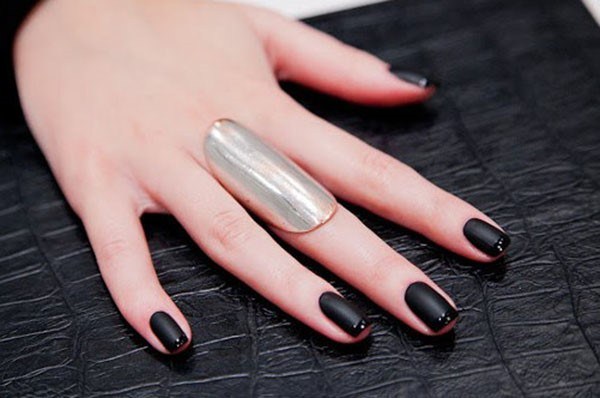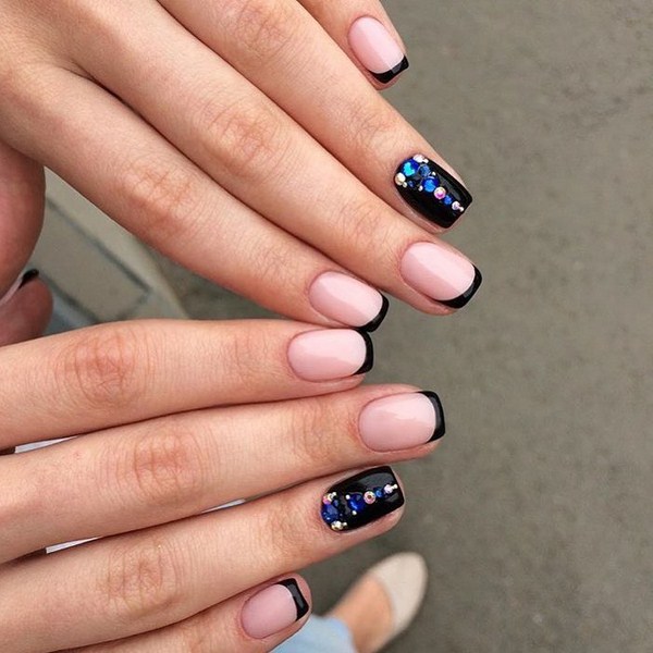 Трендовий і модний чорний френч показаний з чорною основою і металізованим краєм нігтя, класичної напівпрозорої основою і чорним краєм з доповненим одним пальчиків з декором у вигляді малюнка, страз або гліттера.