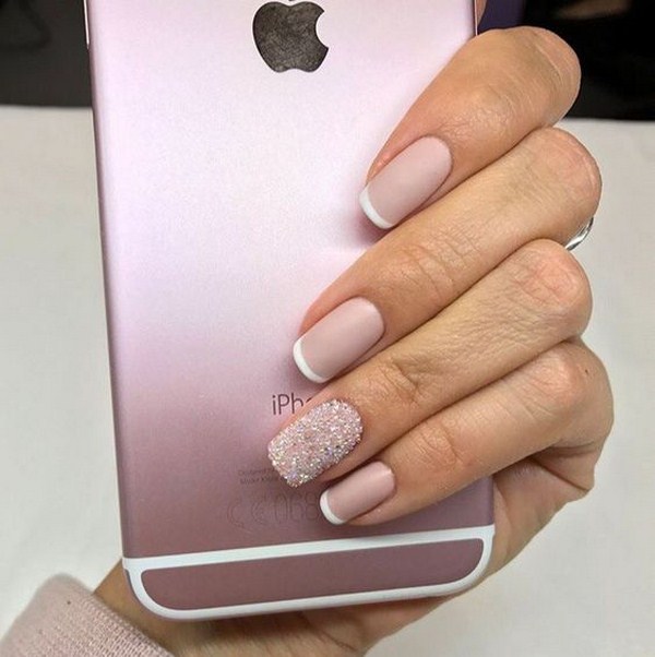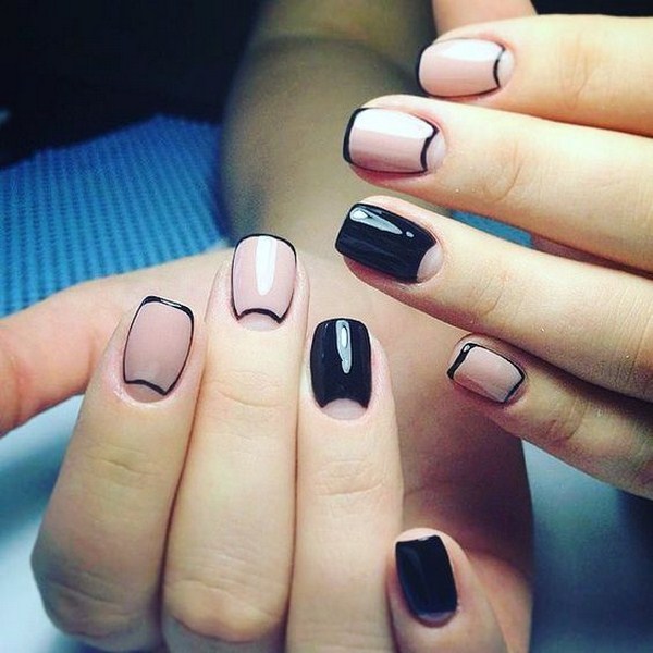Незвичне поєднання ніжних відтінків з контрастним чорним лаком виглядає дуже стильно і привабливо в модному французькому дизайні. Чорним лаком може бути виконана не тільки «посмішка», але весь нігтик в матово-глянсовому рішення для стильного френча.
