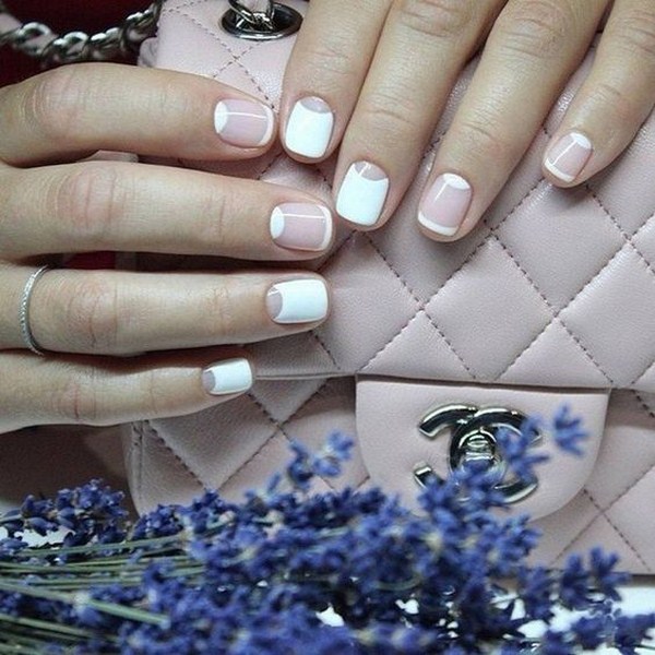 Крім звичайної форми «усмішки» ви можете виконати френч і з незвичним краєм на искосок, по діагоналі, до половини нігтя і іншими варіаціями французького манікюру, що неодмінно не залишить байдужою жодну даму.
