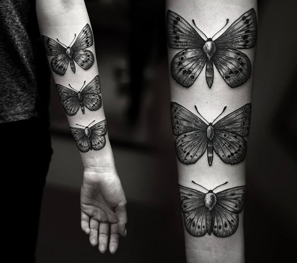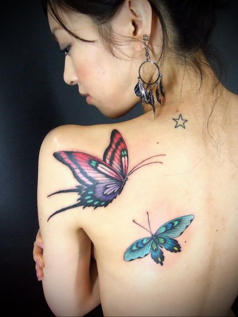 Тату у вигляді метеликів дуже жіночні і без сумніву займуть гідне місце на тілі молодої і красивої дівчини. Прекрасний варіант у виконанні різних яскравих кольорів. Трактування даної татуювання неоднозначна і може бути як символом легковажності, так і характеризувати свою володарку як невагому і повітряну.