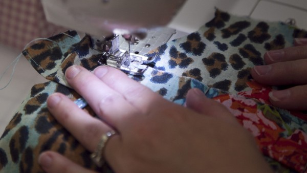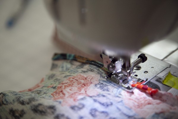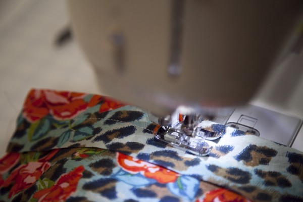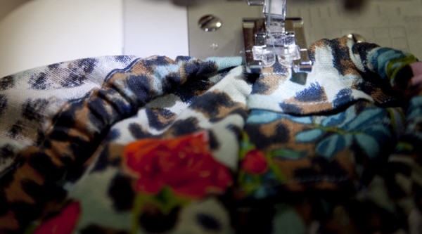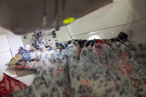 - Коли тканина буде присборена за допомогою гумки, прострочіть всі 3 шари воланів швом шириною 0,3 див. Примітка: нитки вашого шва не повинні проглядатися з лицьової сторони вашого плаття.
