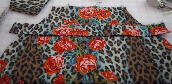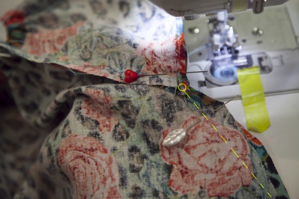 - Виконайте отстрочу уздовж верхньої частини рукава та задньої частини сукні, заклавши тканина на 0,3 і 1,3 см, відповідно. Прострочіть прямим стібками по низу. Не отстрачивайте