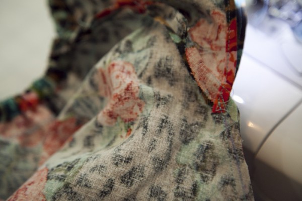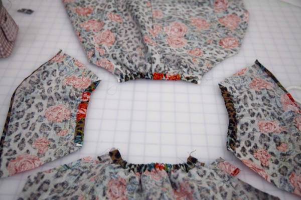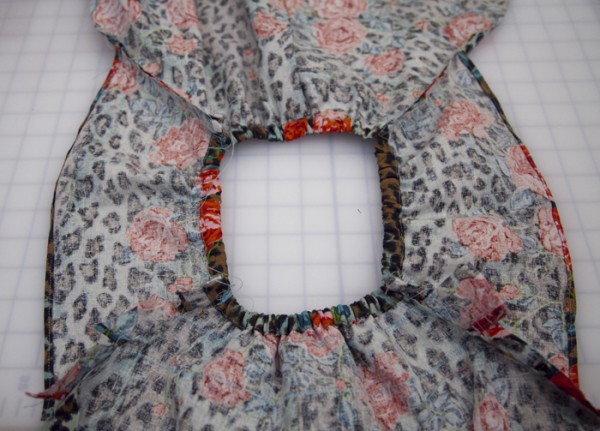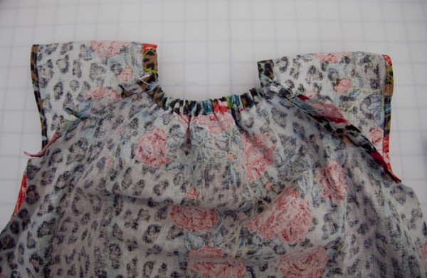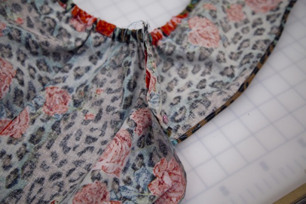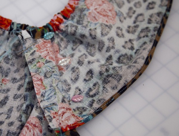 - У місці сточування рукава з сукнею, починаючи від лінії шиї, выстрочите гумкою по краю. Виконайте кілька стібків спереду і ззаду, щоб закріпити кінці з проймою рукава. Це нормально, якщо кінці не збігаються. Переконайтеся, що кінці передньої смужки вшиті в шов рукава.