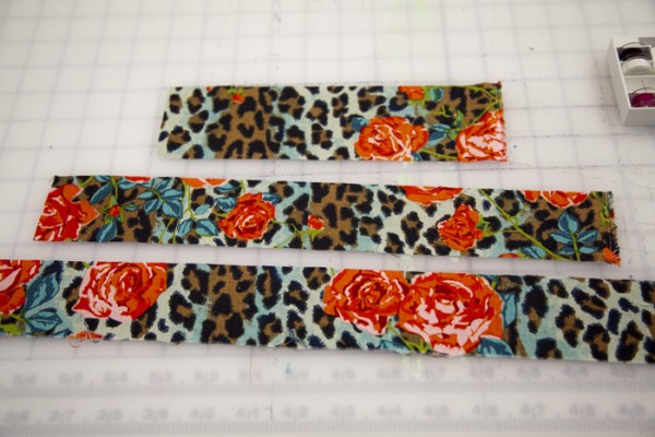 - Виріжте смужки тканини шириною 5 см на 30, 38 і 45 см, які потім ви нашьете на комір спереду плаття в вигляді оборок.