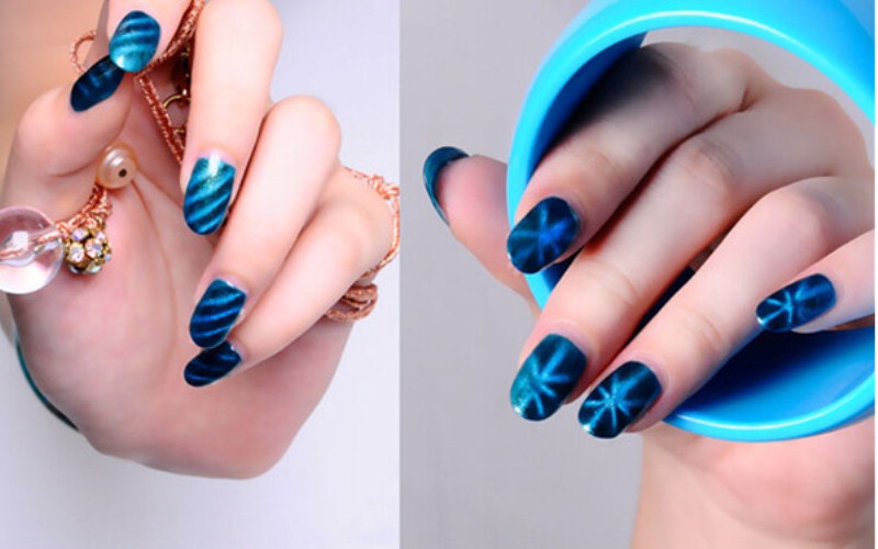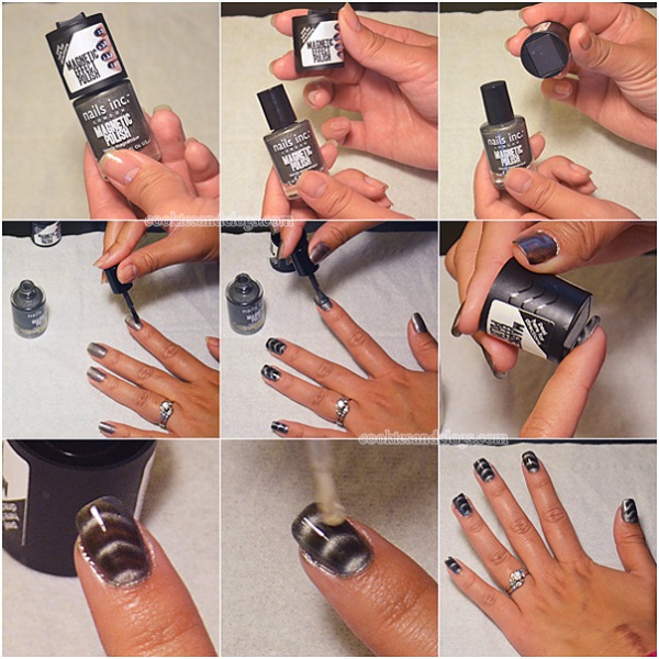 Нігті потрібно покрити лаком, а потім до ще не висохлого шару піднести магніт, від чого металеві частинки, які входять до складу лаку, реагують на нього, збираючись у різні візерунки, форма яких залежить від малюнка на магнітах або від його форми – зірочки, промені, поздовжні або діагональні смужки, хвилі та інше. Малюнок виходить трохи розмитим, має об’ємний ефект.