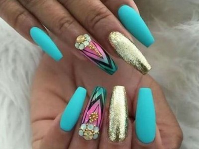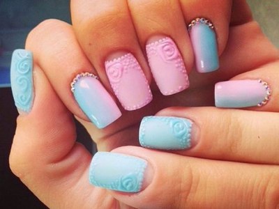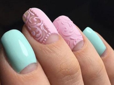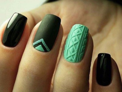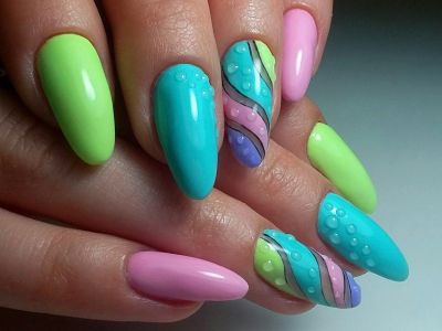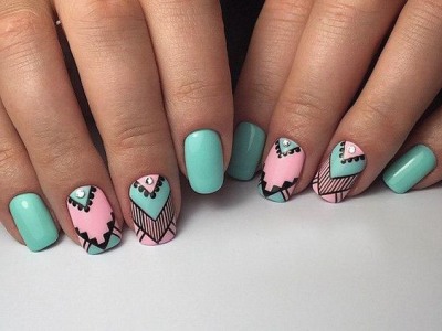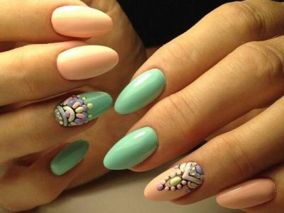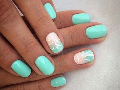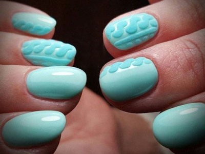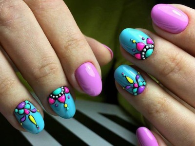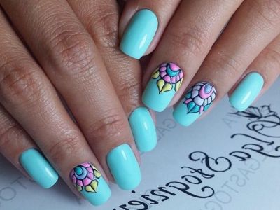 Оригінальне виконання підкорює об’ємними малюнками. Знадобиться гель-фарба і вміння працювати пензликом. Щедро накладайте колір на заздалегідь намальовану підкладку. Робота досить ювелірна, адже лаки можуть розтікатися. Щоб цього не сталося, періодично просушуйте свій арт. Бірюзовий можна поєднувати з усіма можливими відтінками веселки, літній і позитивний ефект вам забезпечений!