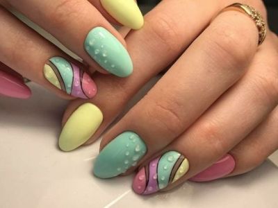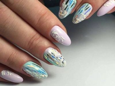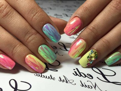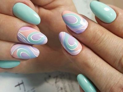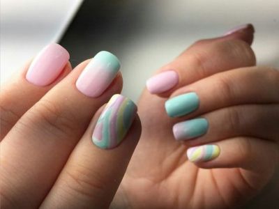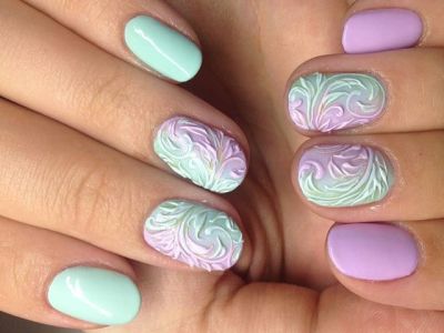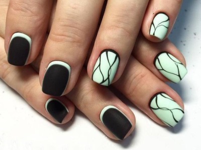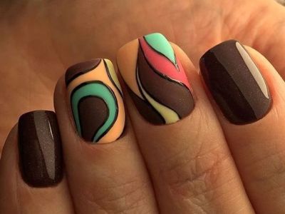 Хочеться чогось незвичайного? Тоді візьміть кисть з довгим ворсом, умочіть її в лаки і поломайте голову над абстрактними візерунками. Популярні поєднання бірюзового з рожевим, жовтим, синім. Тут можна пограти з зовсім непоєднуваними квітами. Подивіться, як оригінально виглядає симбіоз коричневого з топазовым.