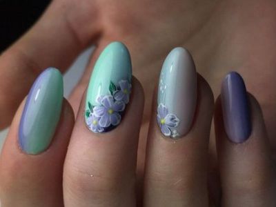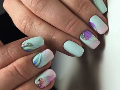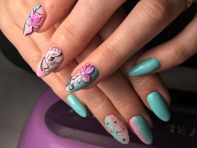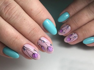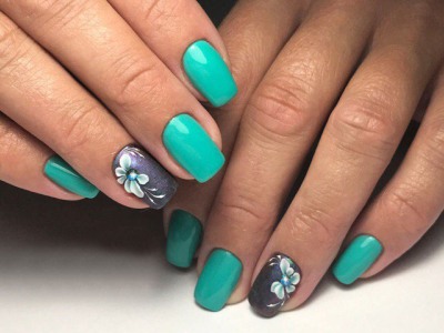 А от щодо художнього розпису обмеження повністю знімаються! Ви тільки подивіться на ці чудеса на нігтики. Зрозуміло, на першому місці стоїть квіткова тематика, адже вона дає такий простір для творчості! Красивий арт з квітами представлений як поодинокими суцвіттями, так і цілими букетами. Бірюзові тони служать не тільки полотно для художника, але і активно застосовуються в самому малюнку. Крім флористики, можна малювати на тему пасторалі, люблять майстрині силуети тварин, веж, повітряних куль, веселку.