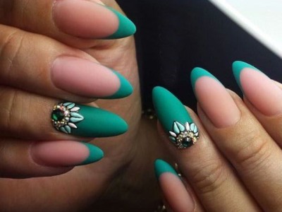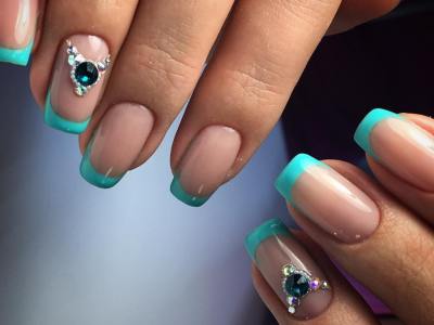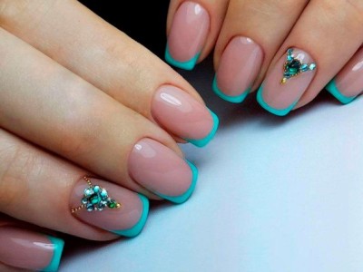Хоча в моду повернулася класична білосніжна посмішка та фан-френч посунувся вбік, бірюзові посмішки все ще в тренді. Для бази вибирайте лаки-камуфляжі. Бажано доповнити французький манікюр декором, будь то стрази, ліплення, камифубуки або бульонки. Особливо гарний такий френч на мигдалеподібної або овальних нігтики, коли ніжність кольору та форми робить результат завершеним.