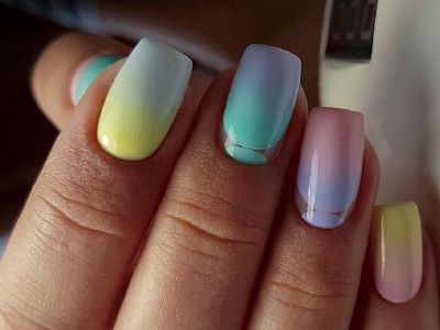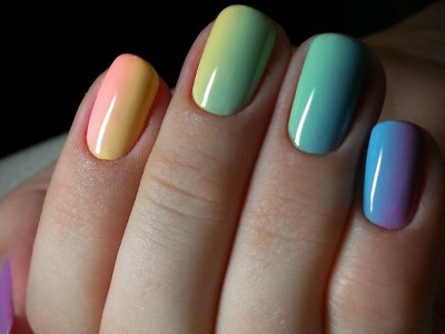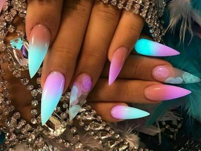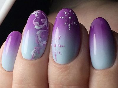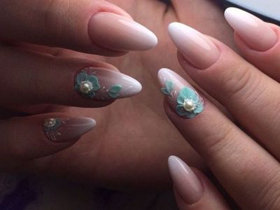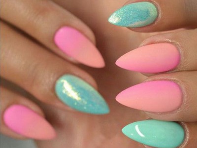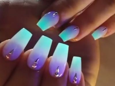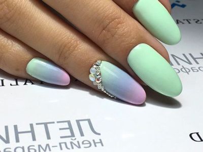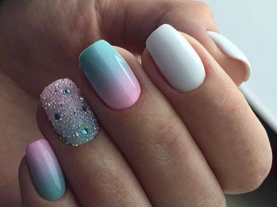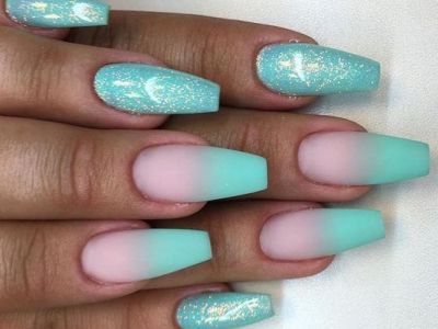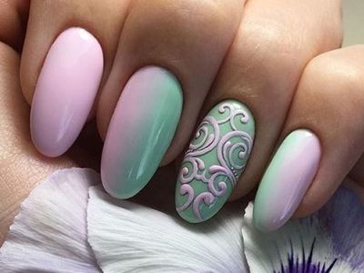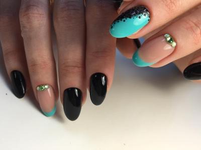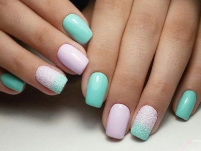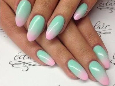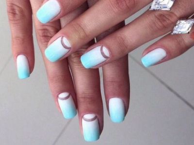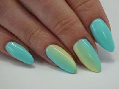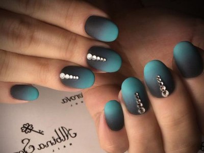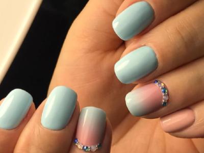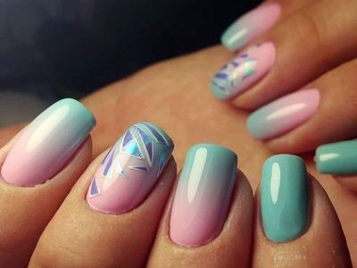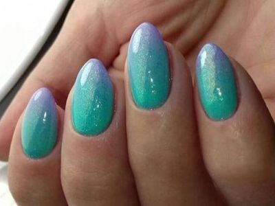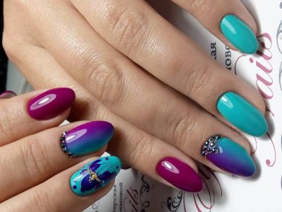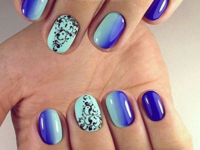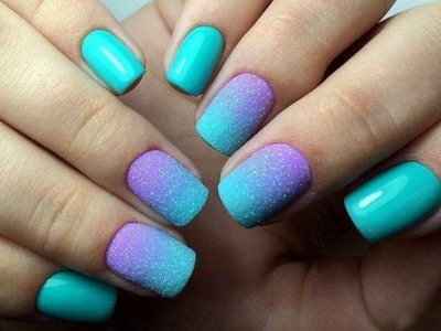 Всі відтінки бірюзи – благодатна база для оформлення омбре. Більш світлі тони добре гармонують з пастельними бежевим, рожевим, білим. Відтінки понасыщеннее з’єднуйте з теплою гамою. Приклад тому – бірюзово-фіолетовий градієнт, який чинить по-справжньому святкове враження. Неймовірно поєднання відтінку «яйця дрозда» з чорним лаком.