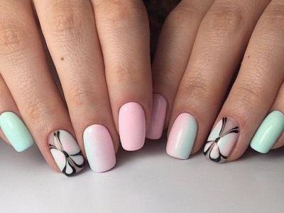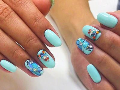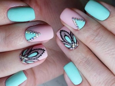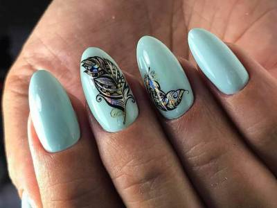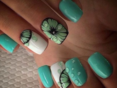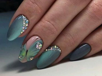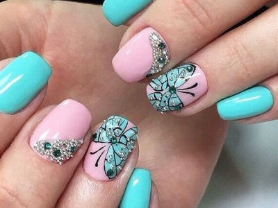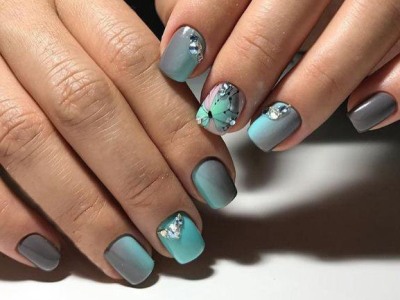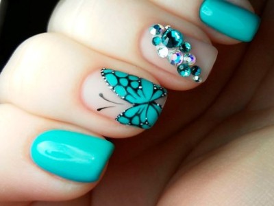 А цей виключно річний наймиліший арт поєднує в собі відразу безліч технік. Щоб зобразити один з цих варіантів на фото, спробуйте заморочити з малюнком, а ще треба вміти поводитися з «битим склом», зробити градієнт, наклеїти стрази або бульонки… Причому іноді все відразу. Але результат того вартий, адже не затримати погляд на такій красі не можна. Бірюзовий арт з метеликами створений для справжніх естетів і перфекціоністів.