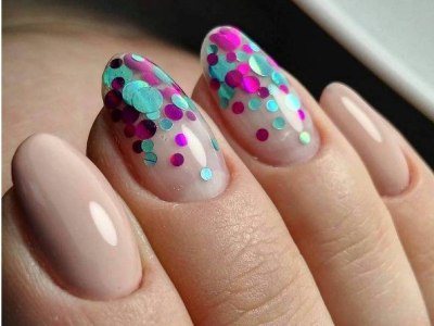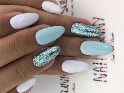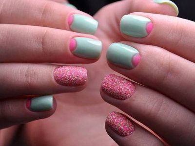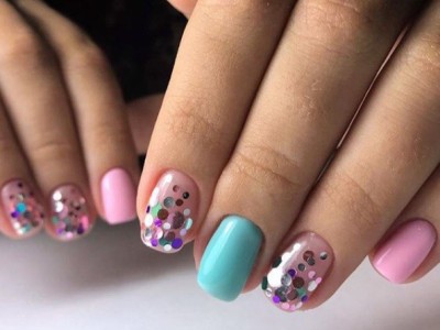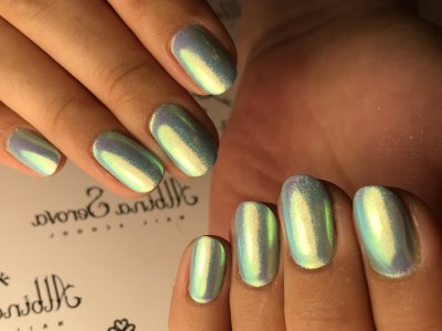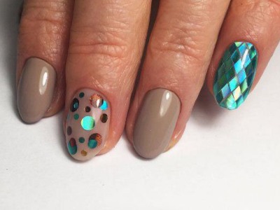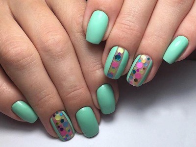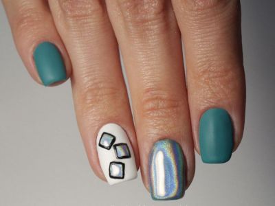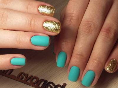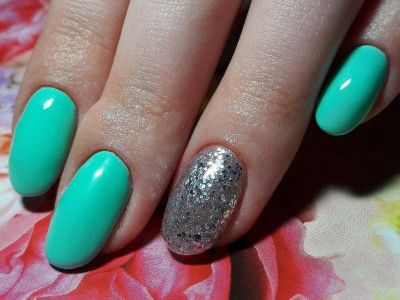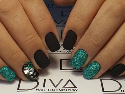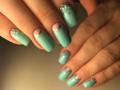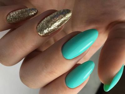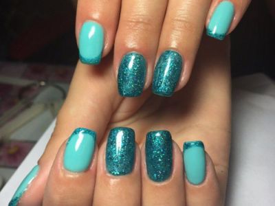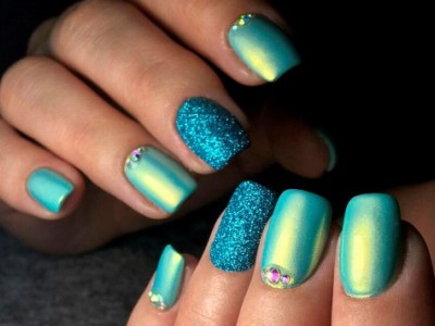 Дрібний шімер втирають в липкий шар так само, як і дзеркальні пігменти. Правда, підсумок виходить багатший. Простіше всього покрити блискітками ніготь повністю, а решта зафарбувати бірюзою або додати до неї який-небудь декор. А ще блисками прикрашають лунки або наносять на малюнки. Процес дуже простий: на фольгу капаєте трохи бази, а в неї додати щіпку шиммера. Розмішуйте пензликом і декорують нігтики, як хочете. Найвдаліші приклади з блискітками – на фото.