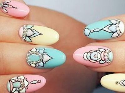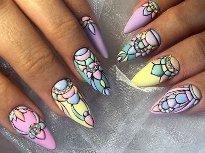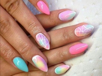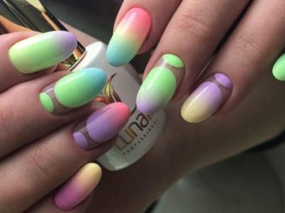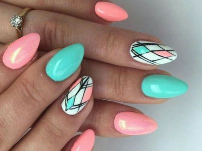 Озброюйтесь пензлем-нулевкой і виводите абстрактні геометричні фантазії на своїх коготках. Кожен отриманий сектор зафарбовуйте окремим кольором. Можна також зробити бірюзово-жовте або лілова омбре і поверх такої витонченості білої гель-фарбою нанести тонкий орнамент.