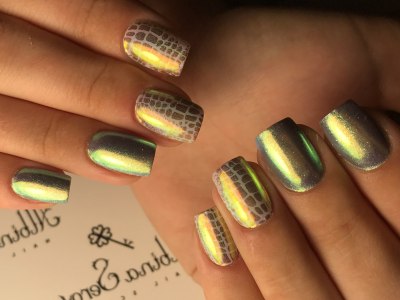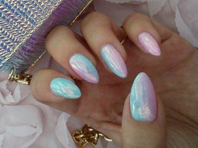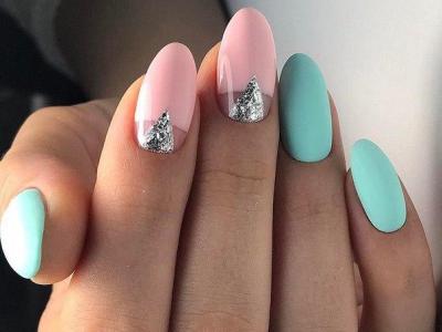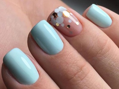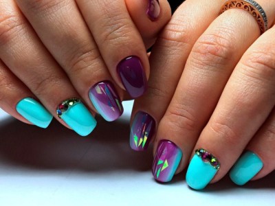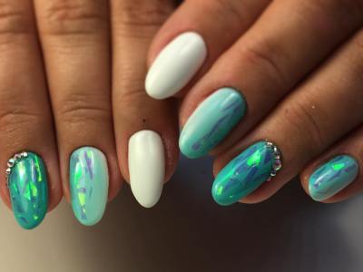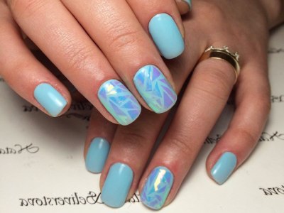 Аквамариновий гель-лак робить делікатним мерехтіння «осколкової» фольги. Класика подібного жанру – омбре, на бірюзової стороні якого розташувалися кілька «скелець». А ще на небесному лаку осколками прикрашають різні композиції – пелюстки квітів, крила метеликів.
