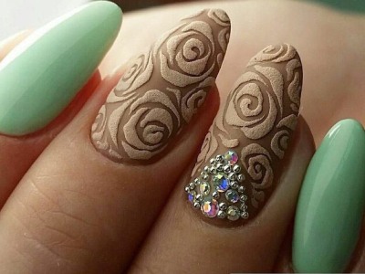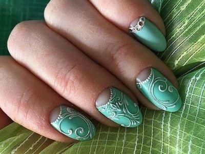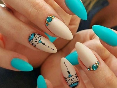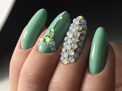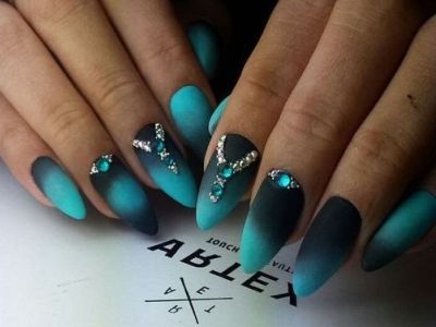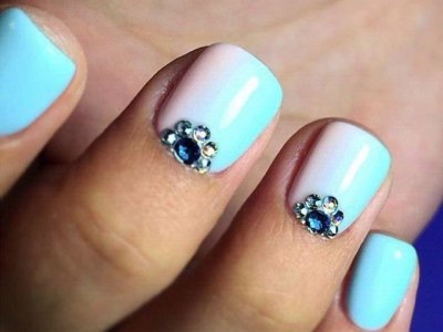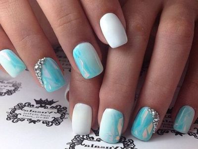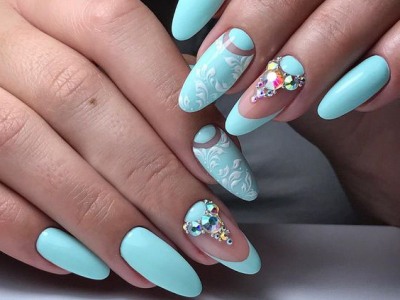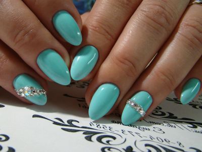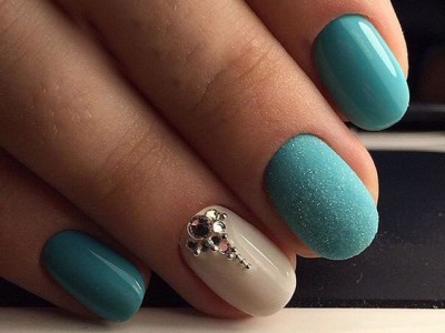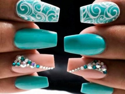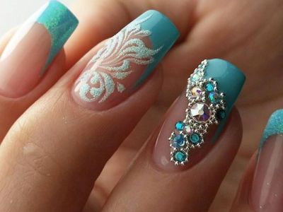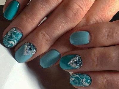 Дорого-багато, вишукано, стильно – все це стрази на бірюзових відтінків! В першу чергу захистите себе кохану від банальності. Ніяких нудних стразин одного розміру, викладених у рядок, це тотально немодно. Краще проявіть фантазію і спорудите іскристі композиції у вигляді кільця, що оперізує ніготь, або додайте їх в якості декору до малюнка. Вже звично, що камінчики обрамляють лунки і складаються в химерні візерунки.