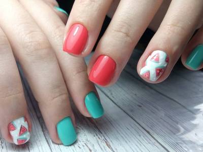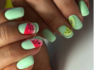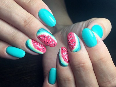 Настав час відпочити про блиску і розкоші і помилуватися забавним і легковажним артом з малюнками фруктів! На бірюзової основі майстрині найчастіше зображують ківі і м’якоть кавуна. Виглядає все це неймовірно реалістично і дуже апетитно! Адже рожевий і зелено-голубий – одне з найбільш вдалих поєднань і в природі, і в нейл-дизайні. Манікюр по-справжньому літній відпускний і смачний. Для більшого антуражу його можна прикрасити «крапельками» – застиглий під ультрафіолетом лак завершує враження соковитих фруктів.