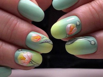 Цей витончений нейл-дизайн – частий супутник французького арту на бірюзі. Гілочки малюють пензлем-лайнером. Робота виглядає кропіткої, хоча насправді досить проста. Бутони можна промальовувати якими завгодно відтінками, вони всі дуже милі.