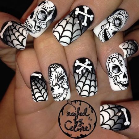 У Голлівуді це свято відзначається особливо яскраво, головна вечірка проходить у Беверлі-Хілз і потрапити на неї мріє кожен. Проте в наших клубах такі вечірки проходять не менш яскраво. Якщо ви вже придумали наряд для Хеллоуїна, підберіть собі відповідний дизайн нігтів для цього свята. Сьогодні ми підібрали 13 ідей дизайну нігтів для святкування Хеллоуїна. Веселого жахливого свята….