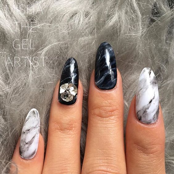 «Мармурові» варіанти манікюру — незвичайна ідея. Тонкі прожилки на білому або чорному тлі створюють малюнок натурального каменю. Нігті виглядають чарівно.