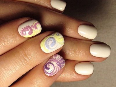 Градієнтний перехід не всі наважуються робити лаками або губкою. Що приховувати – лаки змішувати не дуже-то просто, а губкою можна так извазюкать шкіру навколо нігтя, що потім довго доведеться відтирати сіро-буро-малиновий колір з пальців. Більш просте рішення пропонує, як не дивно, оксамитовий пісок. Техніка елементарна: малюєте узорчік, і на нього сыплете не один колір, а відразу декілька. Коли просушіть і сметете зайве, побачите неймовірну гру кольорів і небанальний нейл-арт!