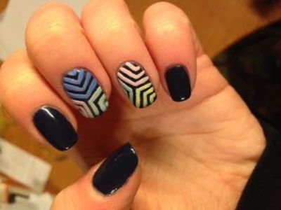 Геометрія на пальчиках втратить всю свою незграбність, якщо її декорувати оксамитом. Натомість з’являться стиль і оригінальність. Популярні маленькі ромбики і різні фігури, особливо нехитрі смуги. Якщо хочете подовжити пластину, оформіть тонкі вертикальні лінії.