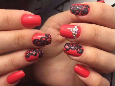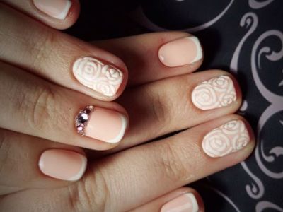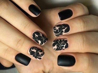 Чудово виглядають нюдовая матова база і чорне «мереживо» на ній, незвичайний оксамит різних відтінків на одному нігті. Французький манікюр з оксамитовим піском дуже люблять нареченої, адже він підкреслює їхню ніжність і чистоту. Піском не декорують лунку, це виглядає не естетично, зате на безіменний пальчик з 3-D візерунком колечко сяде ідеально!
