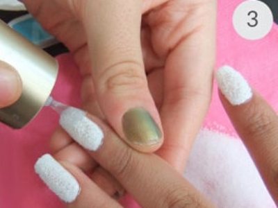 - Далі покрийте нігті кольоровим лаком, можна в кілька шарів. Сушити його не потрібно. Лак розподіляйте рівно по нігтю – навіть незначні «пагорби» і «хвилі» пісок обов’язково видасть! Бажано, щоб пісочок був того ж відтінку, що і ваш шелак. Правда, прозорий декор підходить усім.