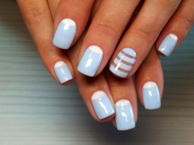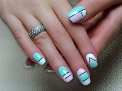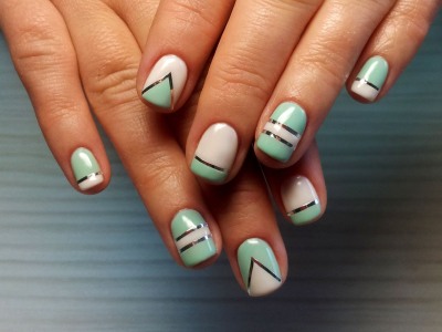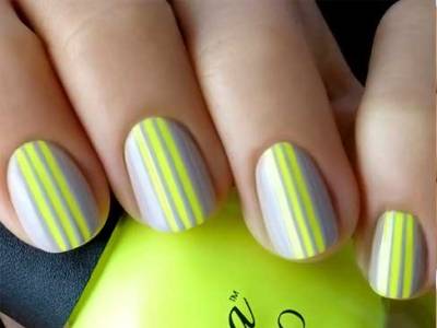 - Однотонний манікюр розбавлять стрічки, розташовані вертикально або перпендикулярно. На темному синьому кольорі вигідніше виглядає металік, а на білому – чорні смужки. Можна, як описано у другому методі, вдатися до стрічок, як допоміжного матеріалу. Наприклад, покривши нігті кислотним жовтим кольором, зверху прикладіть три вертикальні смуги. Далі пофарбуйте шаром сірого лаку. Прибравши стрічки, на їх місці буде просвічувати жовте покриття. Ідеальні рівні смуги візуально витягнуть пластину, створюючи ілюзію довжини.