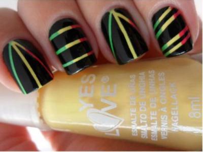 - Тренд останніх сезонів – градієнт вдало доповнюється смугами, перетворюючись на новий унікальний стиль. З допомогою губок неважко зробити омбре на пластинах в домашніх умовах. Альтернатива – просто кілька кольорів, завданих впритул (зелений, жовтий, червоний). Коли все буде готово і ретельно просушіть, наклейте стрічки у відповідності зі своїми вподобаннями. Можна кожен палець прикрашати по-особливому (діагоналі, геометричні фігури, вертикалі, горизонталі та ін). Тепер зафарбуйте поверхню чорним кольором і чекайте поки покриття застигне. Видаливши смуги, ви виявите наскільки оригінально виглядає оголіли різнокольорові ділянки.