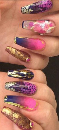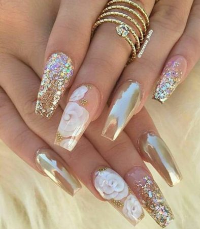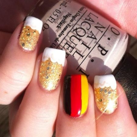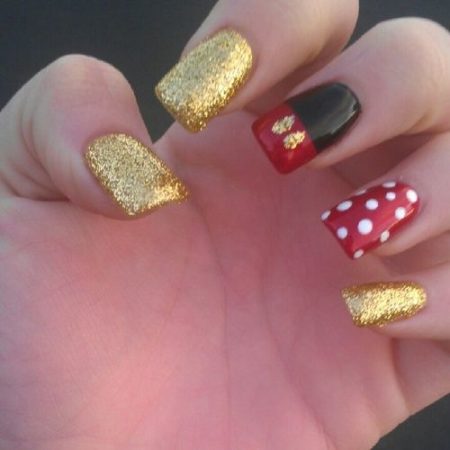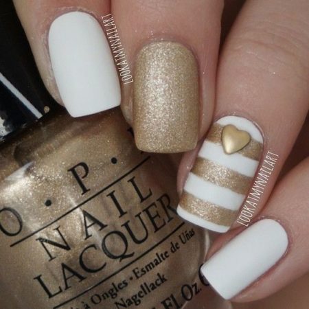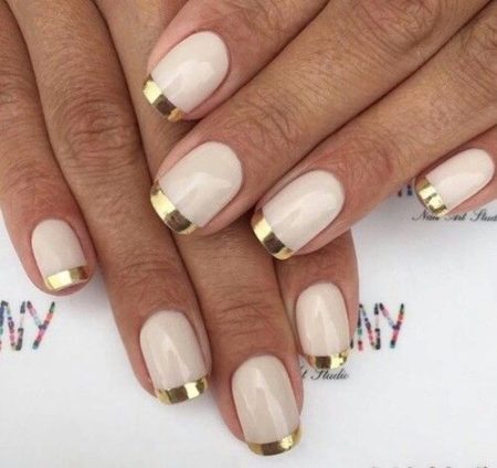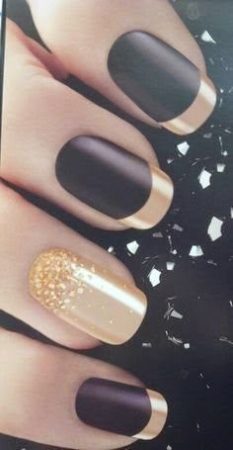 З давніх часів золото було символом багатства і успіху. За золото люди воювали, дарували, грабували, золотом оздоблювали, мили золото. Звичайно, золото не обійшло і дизайн нігтів. В даний час манікюр із золотим лаком можна зробити в будь-якому салоні, Золотий лак можна поєднувати з будь-якими іншими квітами. Манікюр, будь то чорний із золотом або синій, буде виглядати просто розкішно. Золотим лаком можна покрити ніготь повністю, можна використовувати фольгу з золотим відтінком. У дизайні нігтів, золотим можна зробити кінчик нігтя, при виборі французького манікюру, або зробити невеличку золоту смужку. Все залежить від вашого вибору і почуття стилю.