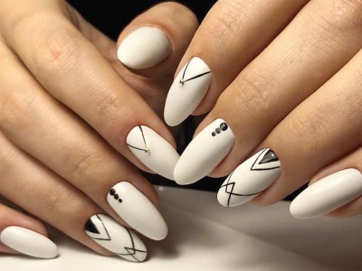 Геометричний дизайн повинен бути дуже лаконічним і чорно-біла гама якнайкраще цьому сприяє. Органічно і стильно виглядають тонкі чорні лінії на білому тлі. Спробуйте намалювати на темному лаку геометричні візерунки білим і сріблястим кольорами, такий одночасно простий і святковий нейл-арт ідеально підійде для будь-якої вечірки. А взагалі згадуйте шкільні уроки і творіть на нігтях що в голову прийде!